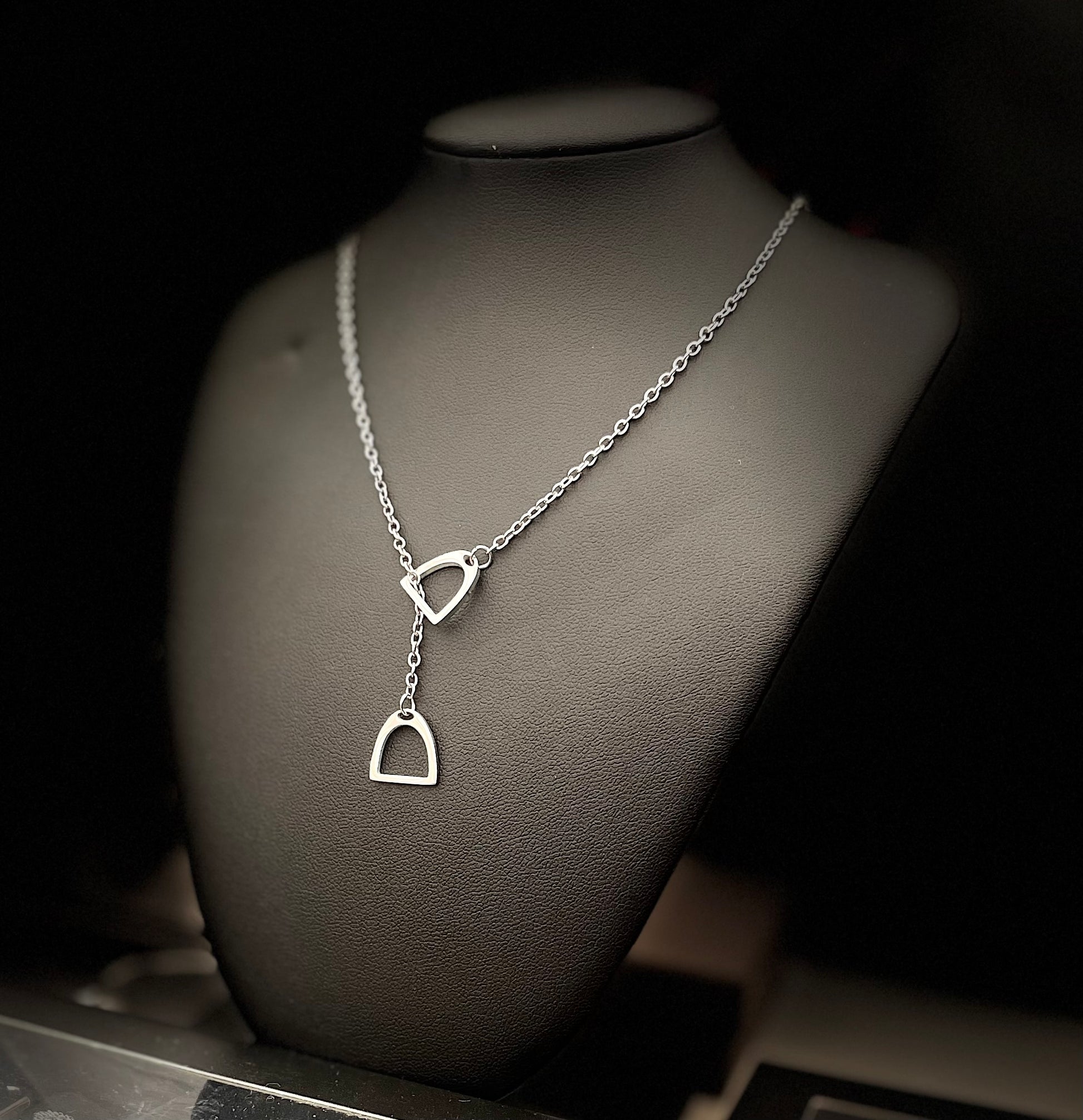 Introducing our newest piece: a modern, minimalist necklace crafted for effortless elegance. Featuring two sleek stirrup-shaped pendants on a polished silver-tone chain, this design adds a contemporary edge to any outfit.